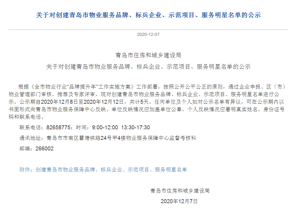 據(jù)悉,該名單公示期自2020年12月8日至2020年12月12日,共計5天。任何單位及個人如對公示名單有異議,可在公示期內(nèi)以書面形式向青島市物業(yè)服務(wù)保障中心反映。