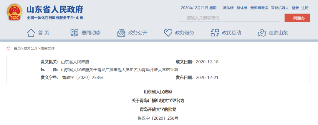 12月21日,據(jù)山東省政府網(wǎng)了解,山東省人民政府批復(fù)山東廣播電視大學(xué)更名為山東開放大學(xué)、青島廣播電視大學(xué)更名為青島開放大學(xué)。更名后,學(xué)校隸屬關(guān)系、管理體制以及原有的學(xué)歷及非學(xué)歷教育辦學(xué)權(quán)不變,法人變更、內(nèi)設(shè)機(jī)構(gòu)、人員編制事宜按照規(guī)定辦理。