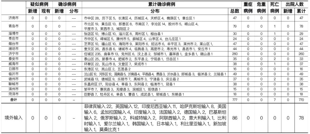 山東省本地病例按確診時醫(yī)院所在縣區(qū)統(tǒng)計,境外輸入病例單獨統(tǒng)計。