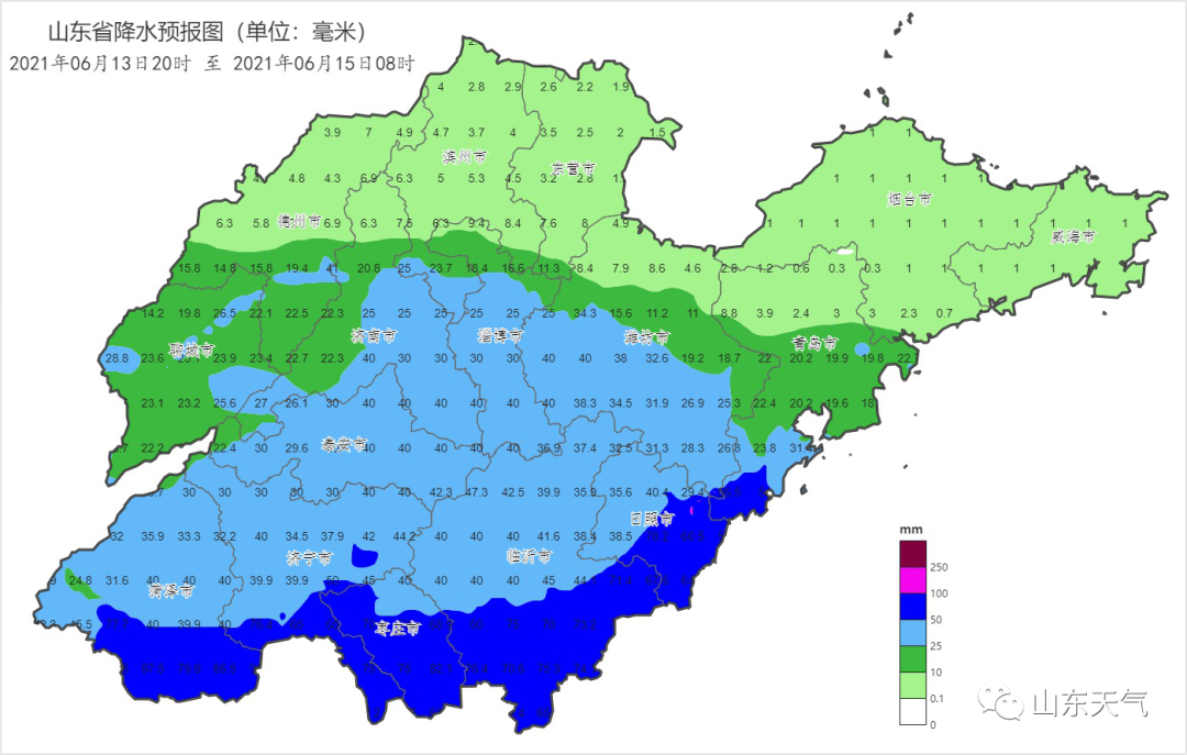 6月13日夜間-15日過程降水量預(yù)報圖(單位:毫米)