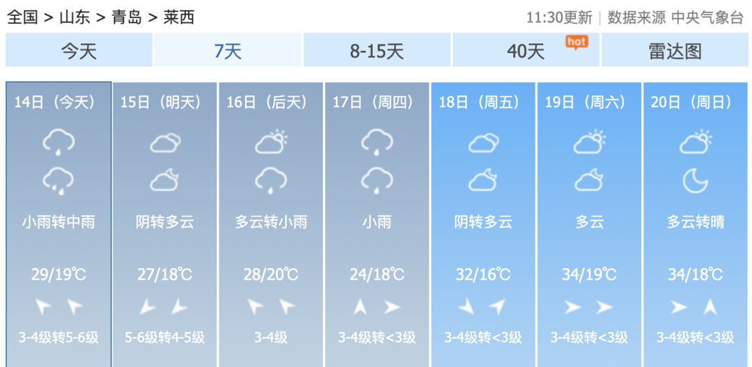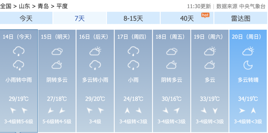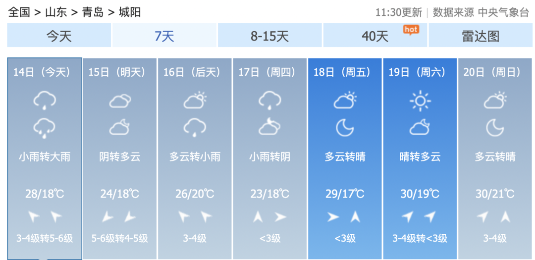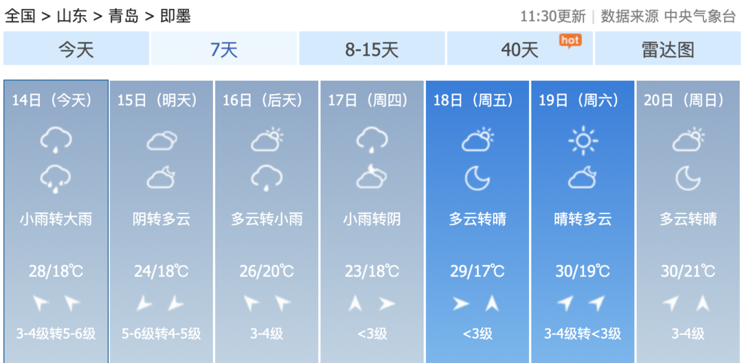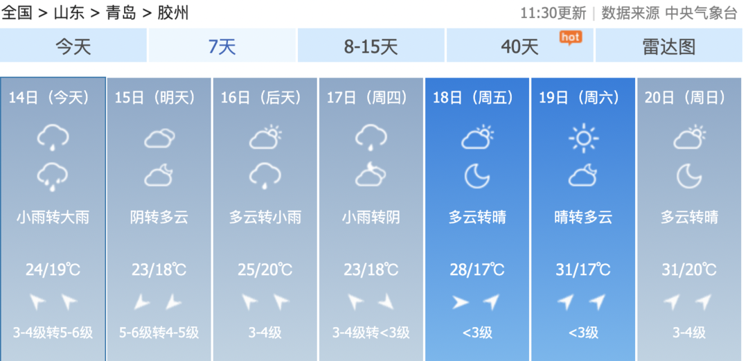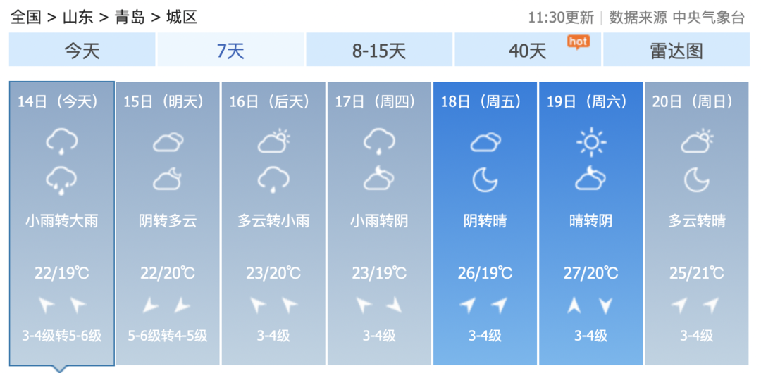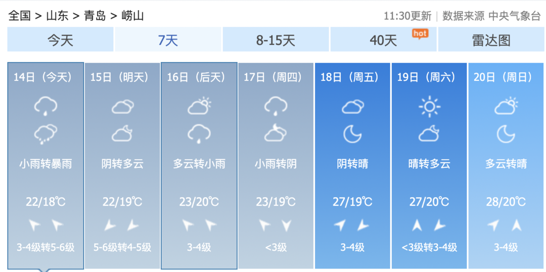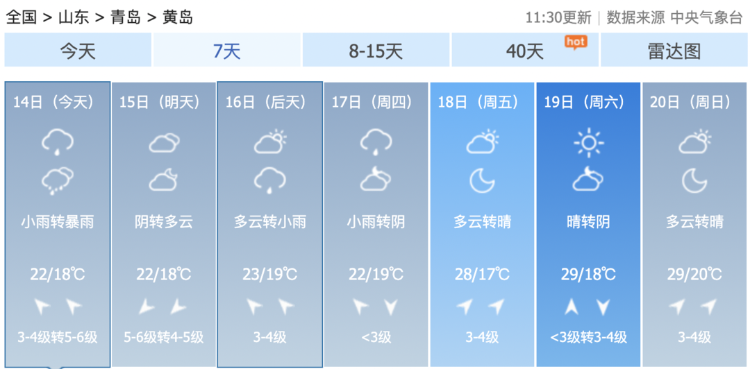 【青島市區(qū)】今天白天,多云轉(zhuǎn)陰有小雨,沿海有時有霧,東南風(fēng)3到4級陣風(fēng)6級,今天夜間,陰有大雨局部暴雨,沿海有時有霧,東南風(fēng)3到4級陣風(fēng)6級轉(zhuǎn)5到6級陣風(fēng)8級,今天最高氣溫22℃,最低氣溫19℃,相對濕度70%-100%。