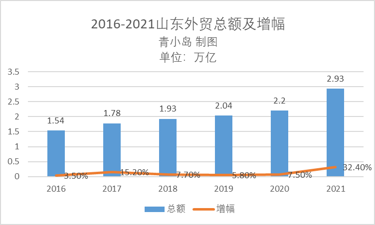 數(shù)據(jù)顯示,2021年山東省進(jìn)出口總額實(shí)現(xiàn)2.93萬億元,連續(xù)第6年創(chuàng)造歷史新高,比2020年增長32.4%,比2019年增長43.1%。其中,出口1.76萬億元,比2020年增長34.8%,比2019年增長58.0%。