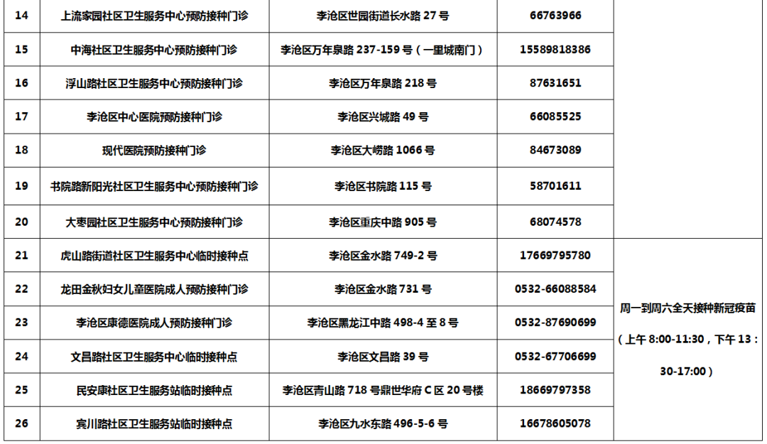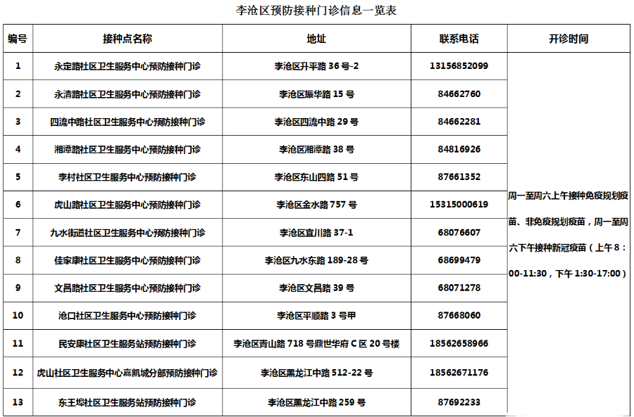 附:李滄區(qū)預防接種門診信息一覽表