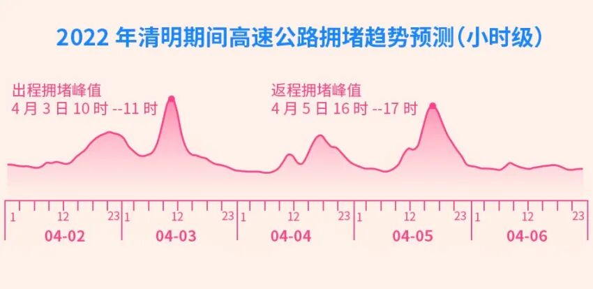 根據(jù)往年節(jié)假日高速公路擁堵趨勢(shì),預(yù)計(jì)4月3日(假期首日)和4月5日(假期最后一天)為高速公路車流量高峰期。受節(jié)前通勤晚高峰及假期前一天出行習(xí)慣影響,預(yù)計(jì)4月2日16點(diǎn)至21點(diǎn)高速擁堵程度也會(huì)有明顯升高。受通行政策影響,預(yù)計(jì)4月3日0點(diǎn)至1點(diǎn),部分高速公路收費(fèi)站也可能會(huì)有偶發(fā)性車多排隊(duì)的現(xiàn)象。