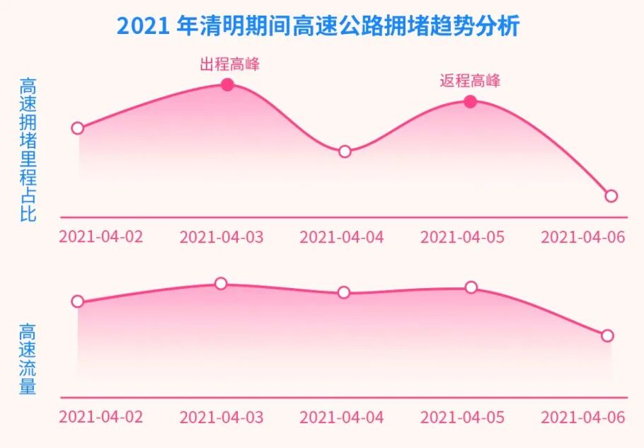 4月3日以出城車輛為主,擁堵峰值出現(xiàn)在8時(shí)至12時(shí)。4月5日為返城高峰期,12至17時(shí)達(dá)到擁堵峰值。