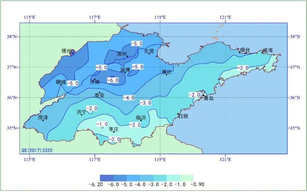 2022年5月6—10日山東省平均氣溫距平分布圖(℃)
