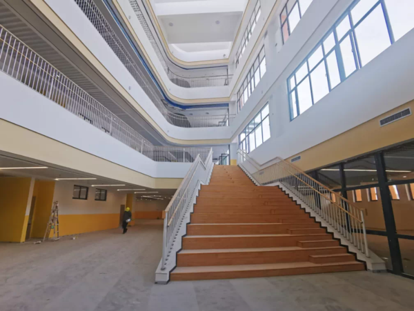 走入綜合樓正門,寬闊的中廳視野開闊,淺黃色、原木色的設(shè)計(jì)襯托出綜合樓內(nèi)溫暖的氛圍。教室里,寬大的窗戶保證了充足的光線,讓整個(gè)教室更顯明亮?!盀楸WC室內(nèi)采光環(huán)境,我們教室里的燈全部采用的都是護(hù)眼燈,有利于孩子們的視力健康。”中建中新建設(shè)工程有限公司新業(yè)路小學(xué)項(xiàng)目項(xiàng)目總工李晗介紹說。