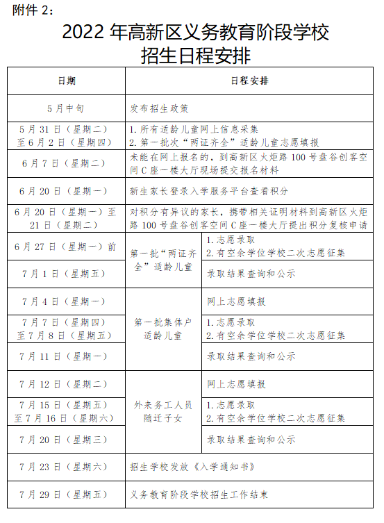 2022年高新區(qū)義務(wù)教育階段學(xué)校招生日程安排如下