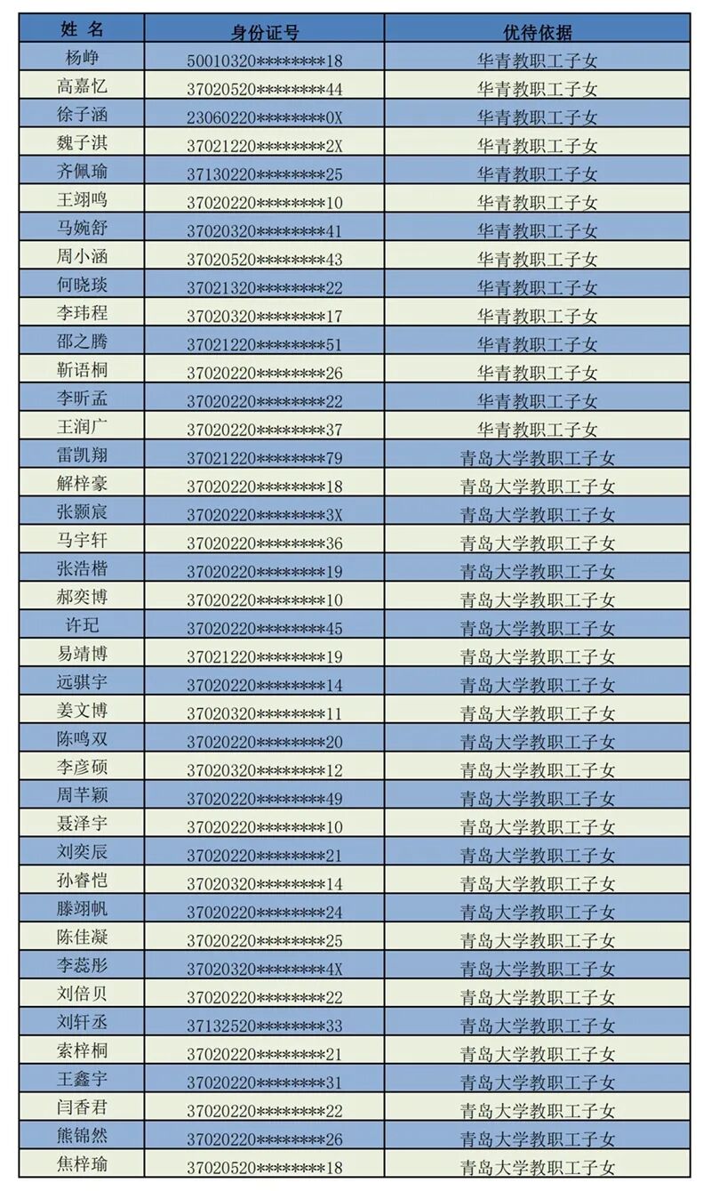 附:青島大學(xué)附屬中學(xué)2022年落實優(yōu)待政策不參加派位直接錄取學(xué)生名單