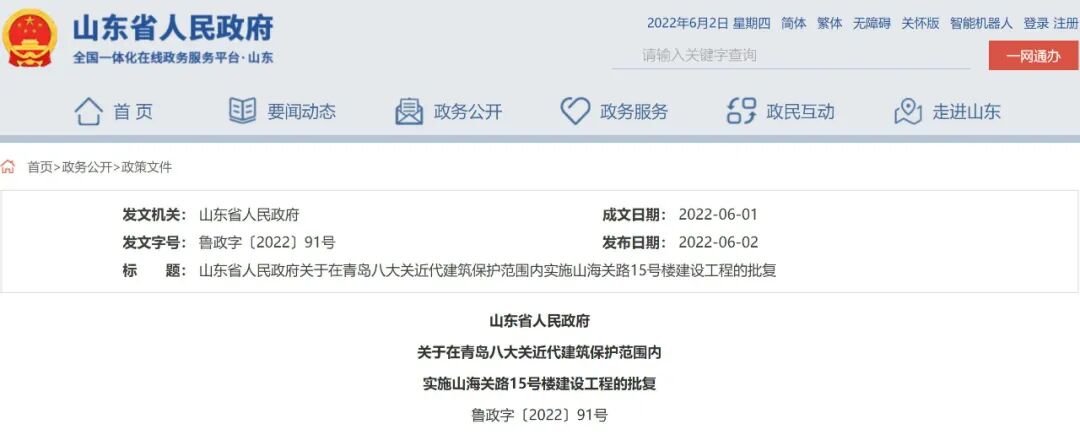 省政府批復(fù):同意青島實(shí)施山海關(guān)路15號(hào)樓建設(shè)工程