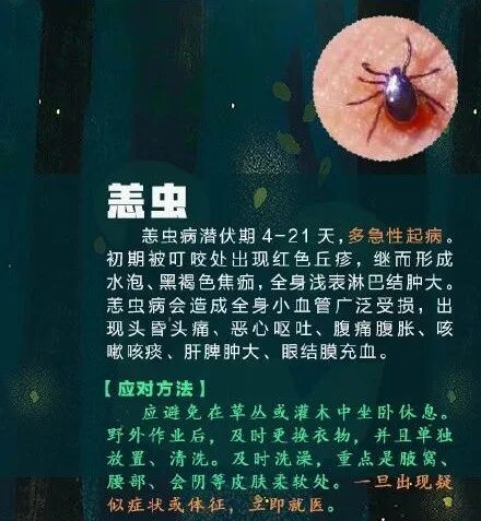 蜱傳疾病發(fā)熱伴血小板減少綜合征重癥患者可引起多臟器功能衰竭而死亡;森林腦炎重癥患者可出現(xiàn)腦膜刺激癥,數(shù)小時內(nèi)進入昏迷、抽搐、延髓麻痹而死亡。此外,萊姆病、新疆出血熱、Q熱、蜱傳斑疹傷寒、野兔熱、人粒細胞無形體病、巴爾通體感染等疾病也是以蜱為主要傳播媒介。需要特別注意的是,除被蜱蟲叮咬外,發(fā)熱伴血小板減少綜合征存在“人傳人”的風險,接觸患者的血液和體液也可能被感染。