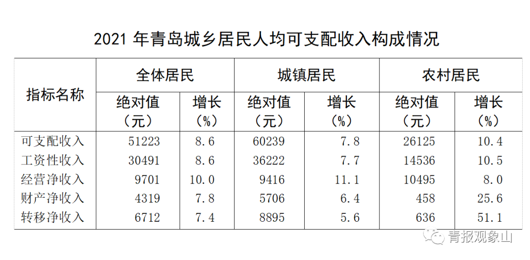 《2021年青島市國民經(jīng)濟和社會發(fā)展統(tǒng)計公報》顯示,2021年,青島市全體居民可支配收入為51223元,工資性收入30491元,占比為59.5%。其中,城鎮(zhèn)居民可支配收入為60239元,工資性收入為36222元,占比為60.1%;農(nóng)村居民可支配收入為26125元,工資性收入為14536元,占比為55.6%。