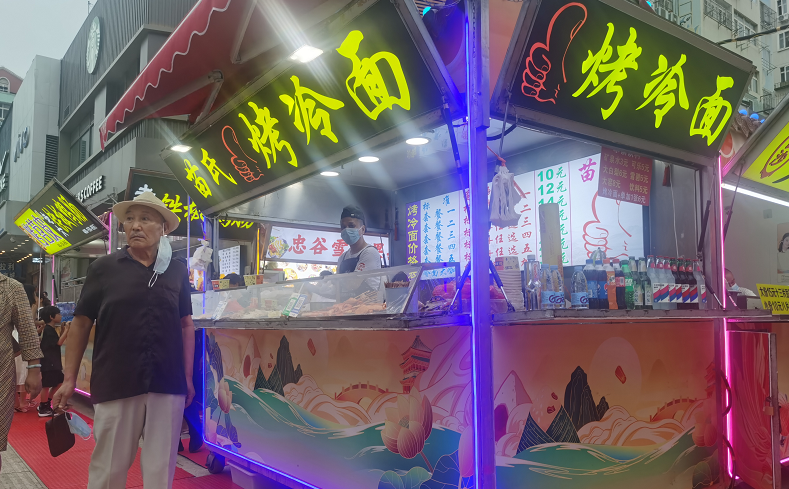 在夜市上,帶著紅袖標(biāo)的管理人員馬庭波不時在人群中穿梭?!鞍逊牢脦炱饋怼薄伴T口的衛(wèi)生注意下”……馬庭波是夜市食品安全管理人之一,他告訴記者,每天都有五六個人來回巡查,確保商戶誠信經(jīng)營和食品的安全衛(wèi)生?!耙故嘘P(guān)閉主要是因為威海路平戰(zhàn)結(jié)合地下工程的頂板施工,但我們也利用這段時間,對小吃街的餐車進行升級,每個餐車外都張貼了國潮風(fēng)的宣傳畫,餐車頂部的燈帶也改成五彩燈泡?!?/p>