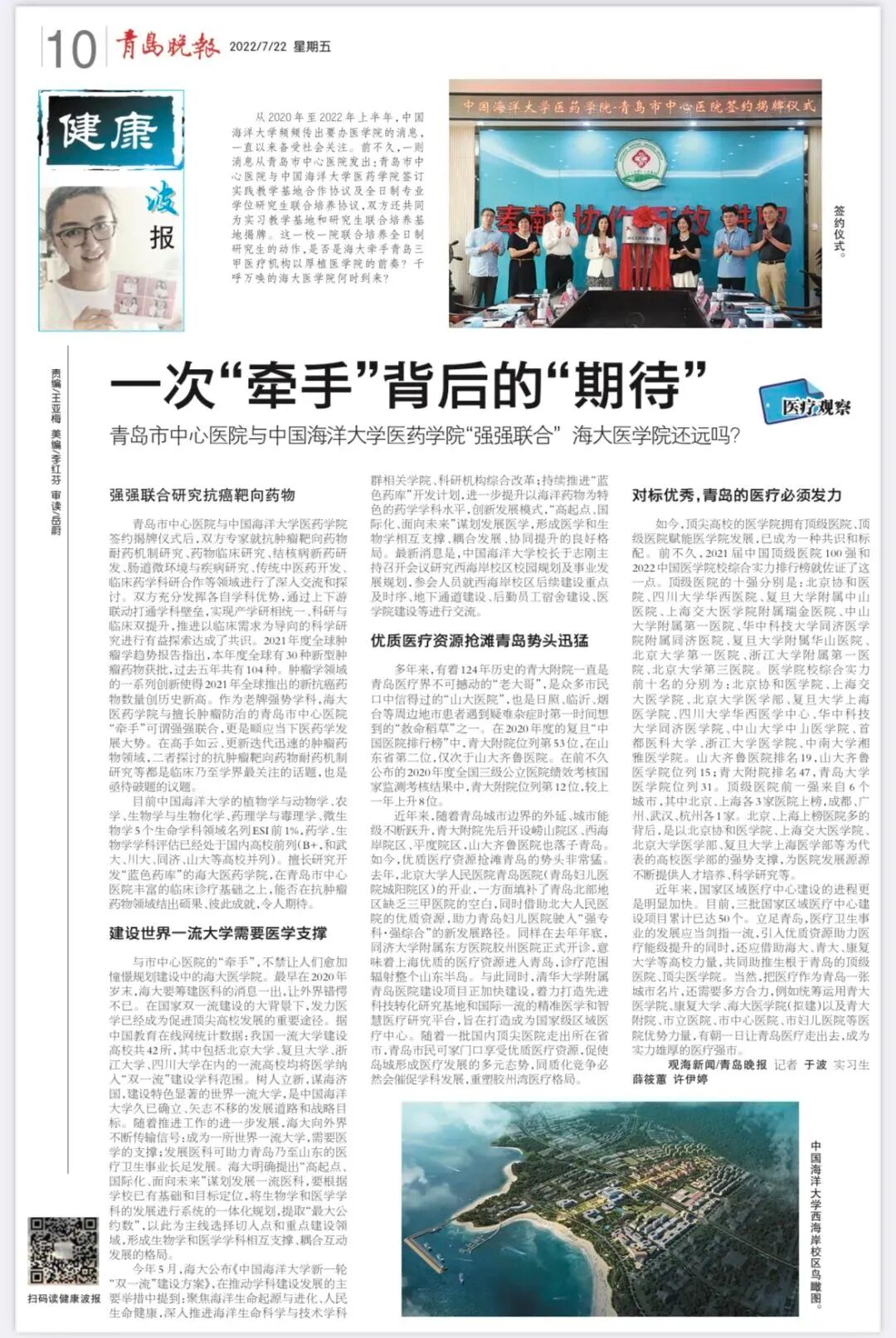 今年5月,海大公布《中國海洋大學新一輪“雙一流”建設(shè)方案》,在推動學科建設(shè)發(fā)展的主要舉措中提到:聚焦海洋生命起源與進化、人民生命健康,深入推進海洋生命科學與技術(shù)學科群相關(guān)學院、科研機構(gòu)綜合改革;持續(xù)推進“藍色藥庫”開發(fā)計劃,進一步提升以海洋藥物為特色的藥學學科水平,創(chuàng)新發(fā)展模式,“高起點、國際化、面向未來”謀劃發(fā)展醫(yī)學,形成醫(yī)學和生物學相互支撐、耦合發(fā)展、協(xié)同提升的良好格局。