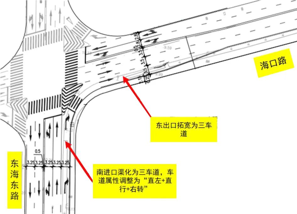 1、南進口渠化為三車道,進口車道屬性調(diào)整為“直左+直行+右轉(zhuǎn)”,提高路口通行效率;