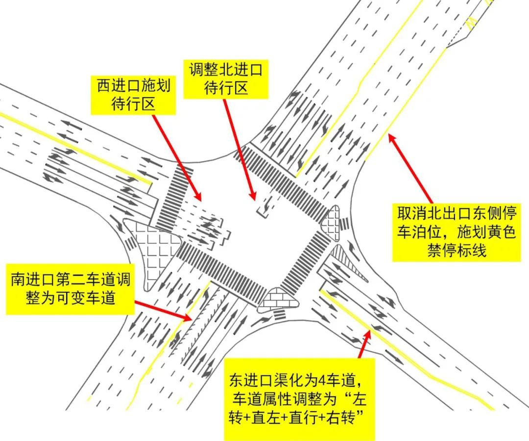 4、調(diào)整北進口待轉(zhuǎn)區(qū)位置,避免與南向北直行車輛沖突;取消北出口東側(cè)的停車泊位,施劃黃色禁停標(biāo)線。