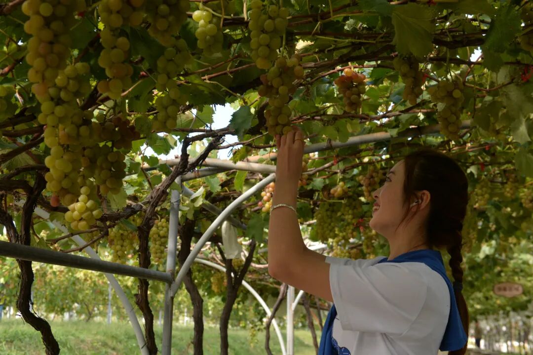 在平度市大澤山鎮(zhèn)的主會場,“葡萄”是最醒目的元素。這個季節(jié),大澤山3萬余畝葡萄園層巒疊嶂,300多個品種迎來成熟季,陽光玫瑰葡萄清脆飽滿,巨峰葡萄皮薄肉厚味美……吸引著四面八方的游客前來采摘游玩。