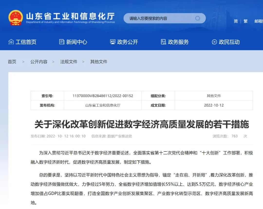 10月12日,山東省工業(yè)和信息化廳發(fā)布《關(guān)于深化改革創(chuàng)新促進(jìn)數(shù)字經(jīng)濟(jì)高質(zhì)量發(fā)展的若干措施》(下稱《若干措施》),提出6個方面23條具體措施,著力推動數(shù)字經(jīng)濟(jì)做強(qiáng)做優(yōu)做大,明確提出——