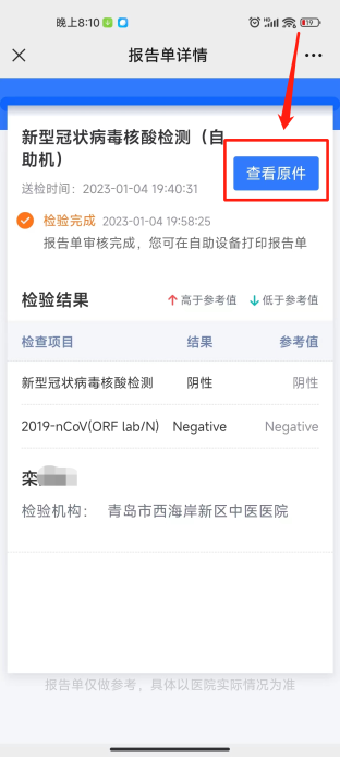 核酸檢測時間6-8小時,結(jié)果出具后,需要中英文對照報告的市民可在院內(nèi)自助機(jī)完成報告打印或者微信公眾號查詢電子版報告原件。