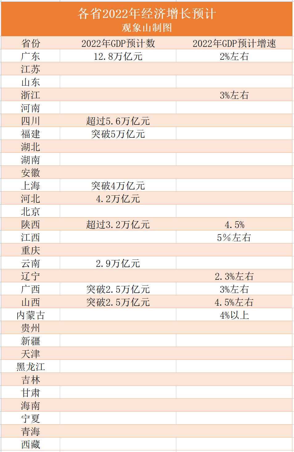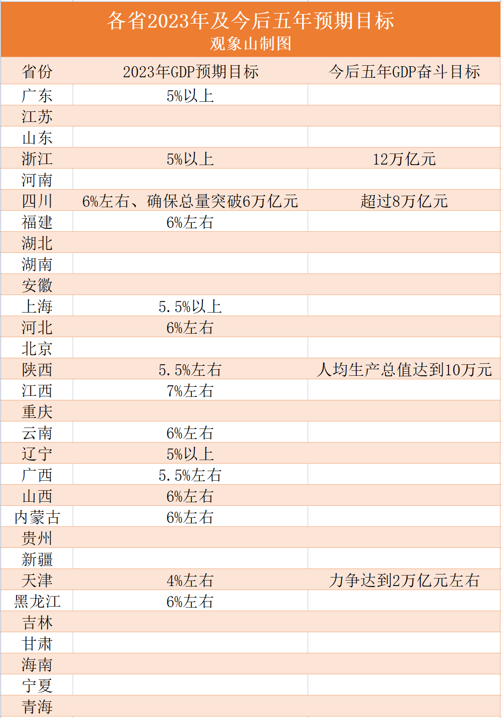 截至目前,已經(jīng)有15個(gè)省份公布了2023年GDP增長(zhǎng)預(yù)期目標(biāo),其中,廣東省、浙江省、遼寧省提出的目標(biāo)是“增長(zhǎng)5%以上”;上海市、陜西省、廣西壯族自治區(qū)提出的目標(biāo)是“5.5%左右”;四川省、福建省、河北省、云南省、山西省、內(nèi)蒙古自治區(qū)、黑龍江省提出的目標(biāo)是“6%左右”;江西省提出的目標(biāo)是“7%左右”;天津市提出的目標(biāo)是“4%左右”。