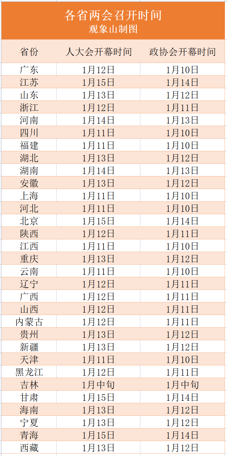 自1月10日起,各省兩會(huì)陸續(xù)拉開(kāi)帷幕,至1月12日,全國(guó)已經(jīng)有24個(gè)?。ㄗ灾螀^(qū)、直轄市)相繼進(jìn)入“兩會(huì)時(shí)間”,其余省級(jí)行政區(qū)也公布了時(shí)間表,均將于1月中旬陸續(xù)召開(kāi)。