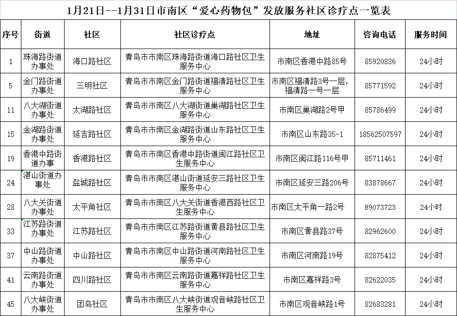 市南區(qū)公布春節(jié)期間“愛心藥物包”發(fā)放服務(wù)社區(qū)診療點(diǎn)一覽表