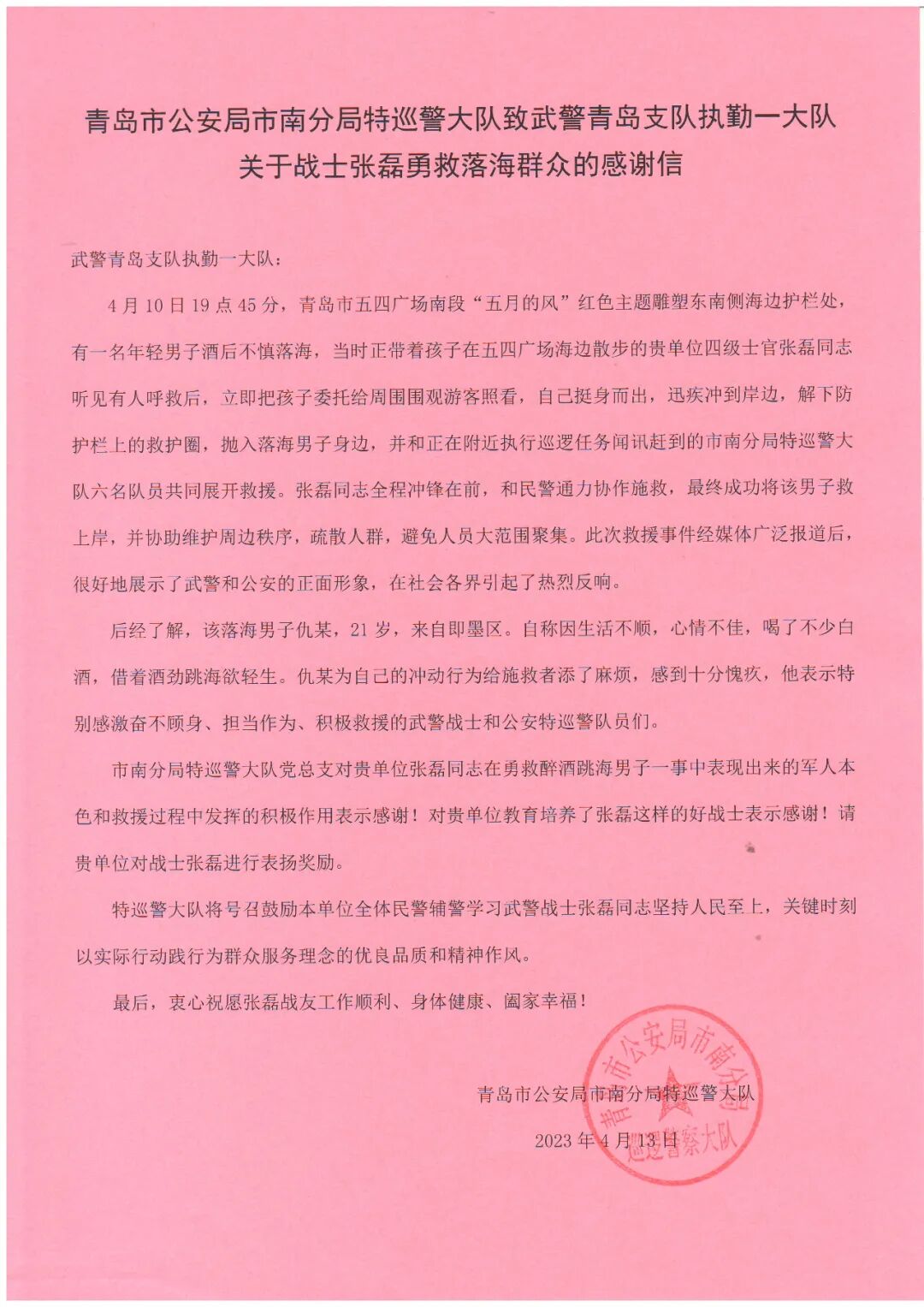 ▲圖為青島市公安局市南分局寫給張磊的感謝信