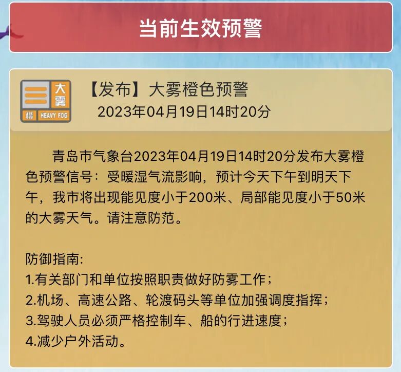 青島市氣象臺19日14時(shí)20分發(fā)布大霧橙色預(yù)警信號:受暖濕氣流影響,預(yù)計(jì)今天下午到明天下午,我市將出現(xiàn)能見度小于200米、局部能見度小于50米的大霧天氣。請注意防范。