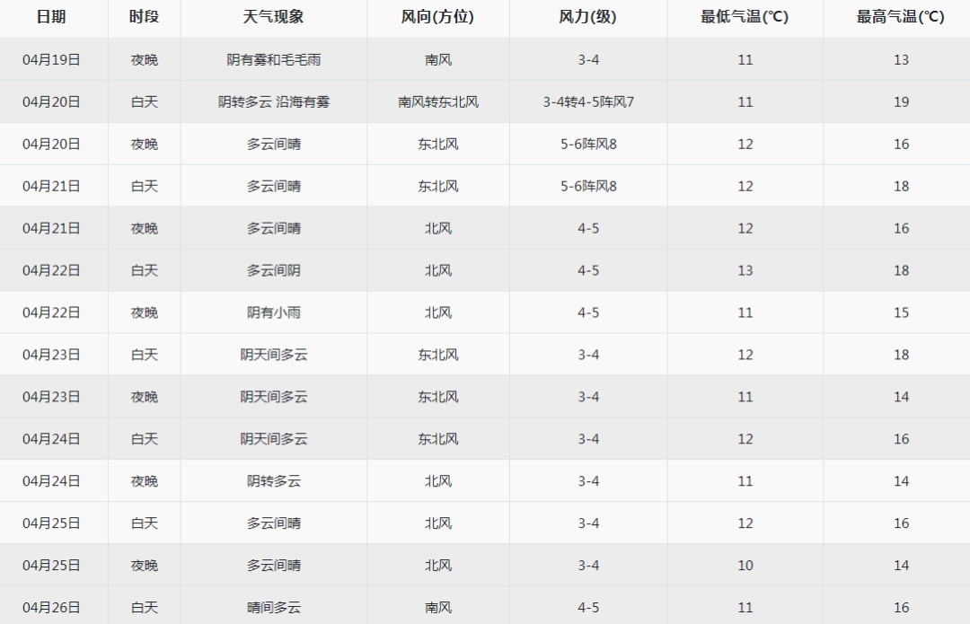 青島日報(bào)社/觀海新聞4月19日訊 預(yù)計(jì)今天夜間,青島陰有霧和毛毛雨,南風(fēng)3到4級,氣溫11到13℃。明天白天,陰轉(zhuǎn)多云,沿海有霧,南風(fēng)3到4級轉(zhuǎn)東北風(fēng)4到5級陣風(fēng)7級,氣溫11到19℃。明天夜間,多云間晴,東北風(fēng)5到6級陣風(fēng)8級,氣溫12到16℃。