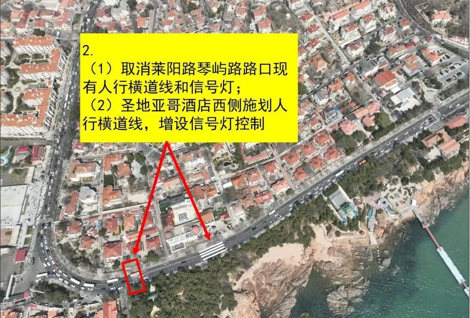 2.取消萊陽路琴嶼路路口現(xiàn)有人行橫道線和信號燈,移至圣地亞哥酒店西側(cè)。