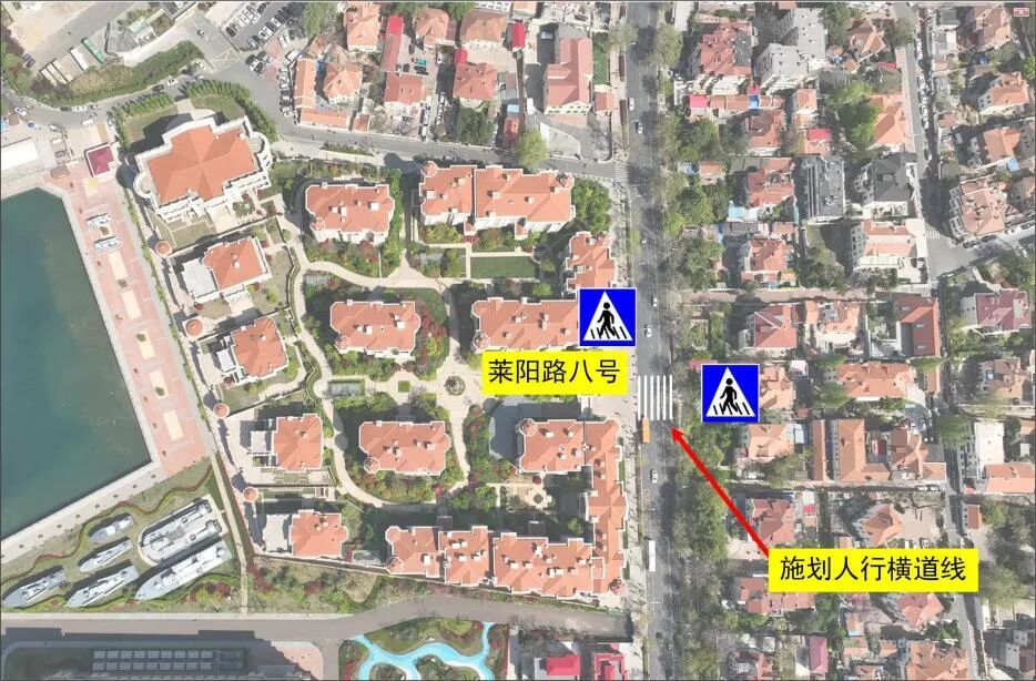 1.取消現(xiàn)有人行橫道線,將該處人行橫道線移至萊陽路八號門前。海軍博物館門前增設(shè)可活動式護(hù)欄,實現(xiàn)人車分離。