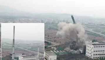 高達153米的紅白相間的大煙囪按預定計劃順勢向南倒去。
