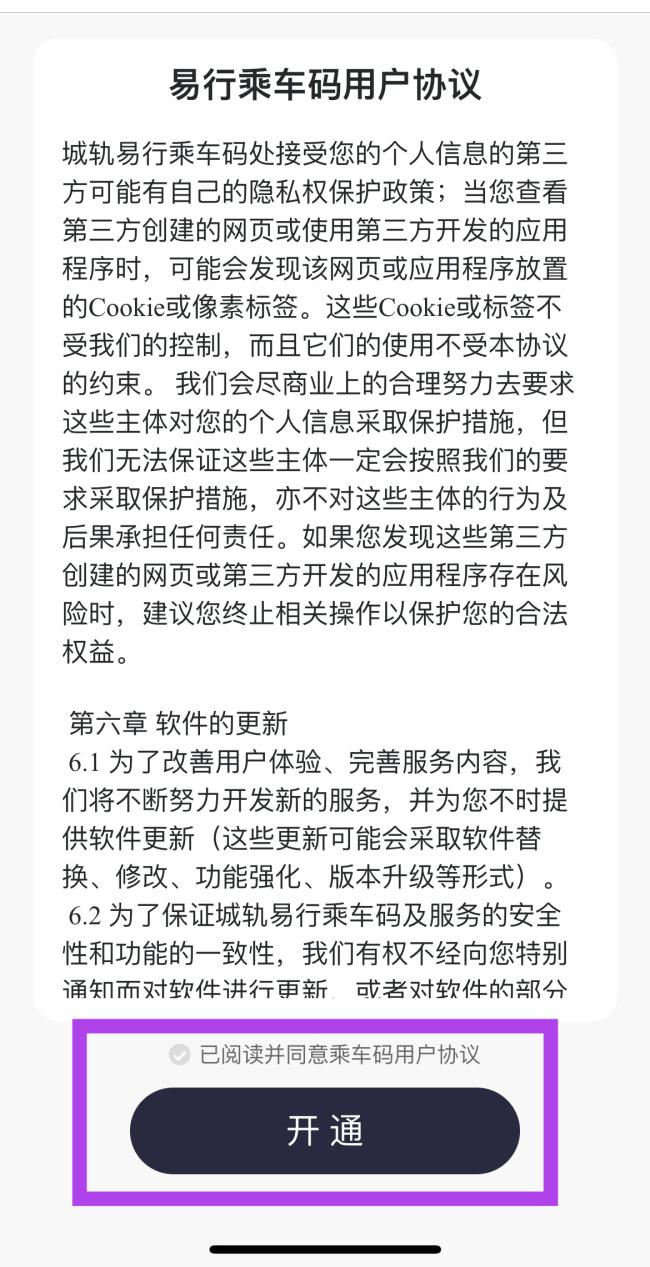 ●如青島地鐵App未實名認證,則需根據(jù)提示完成實名認證。如果已實名認證,將跳轉(zhuǎn)至授權(quán)頁面。閱讀并點擊“已閱讀并同意乘車碼用戶協(xié)議”后,點擊“開通”按鈕便開通成功啦。