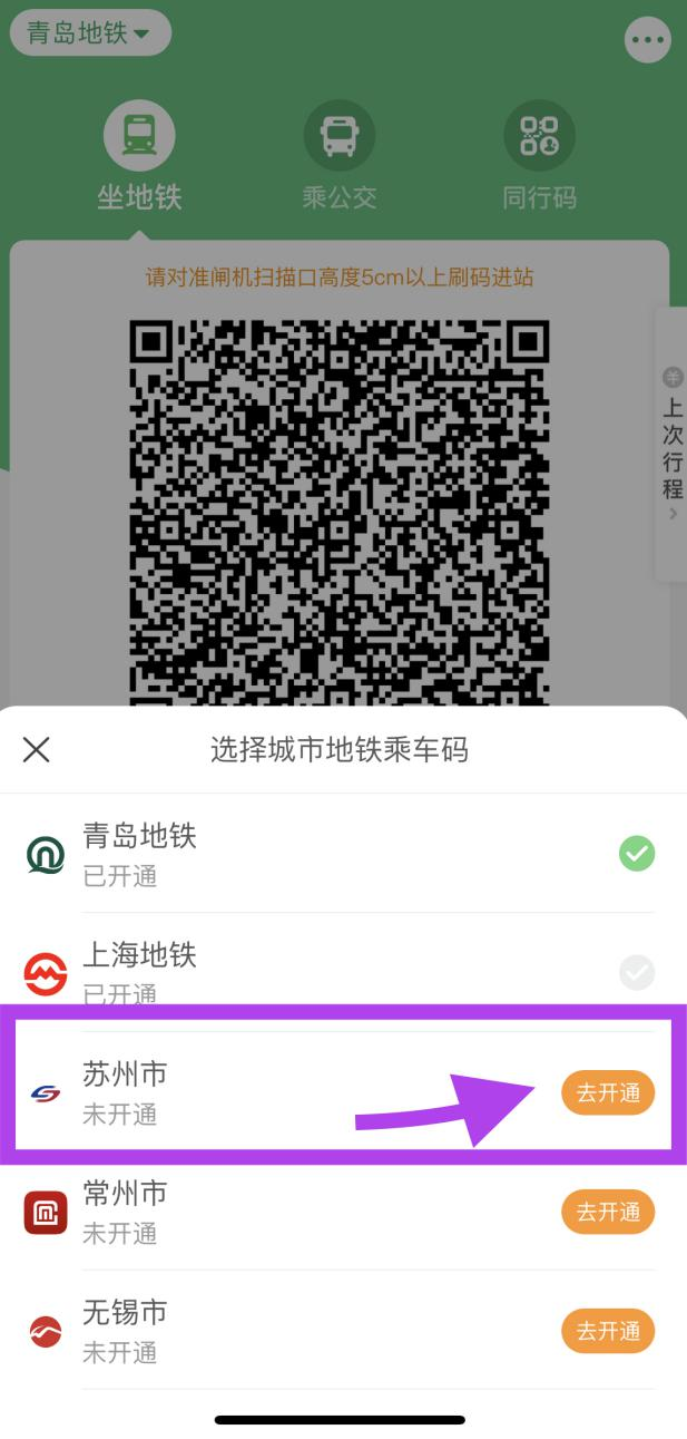 ●選擇想要開通城市地鐵乘車碼,以蘇州地鐵為例,點擊“去開通”。