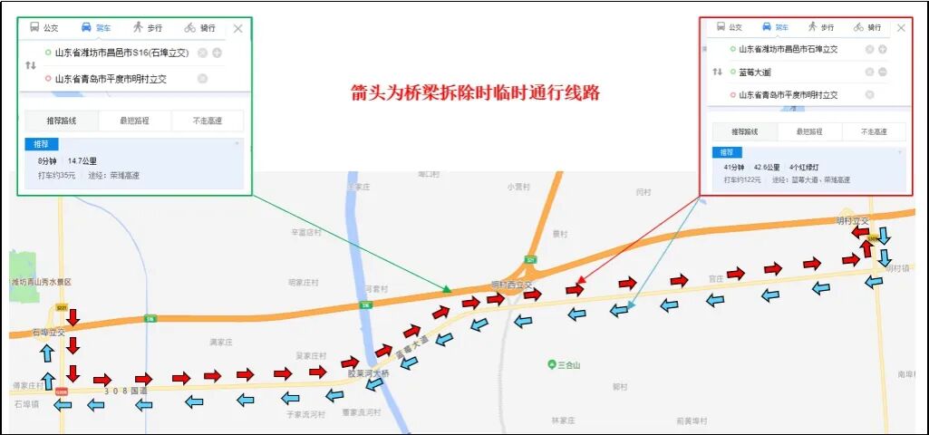 自2023年6月12日9時至2023年6月12日10時,對S16榮濰高速石埠立交至明村立交進(jìn)行封閉演練,2023年6月13日8時起至2023年6月15日8時,正式對S16榮濰高速石埠立交至明村立交進(jìn)行封閉拆橋施工。屆時,S16榮濰高速石埠立交去往榮成方向的主線、匝道全部封閉;S16榮濰高速明村立交去往濰坊方向的主線、匝道全部封閉;S21新濰高速明村西立交萊州至榮成方向匝道、濰坊至萊州方向、榮成至萊州方向全部封閉。S16榮濰高速由濰坊至榮成方向行駛車輛可從石埠收費(fèi)站出站繞G308國道行至明村收費(fèi)站進(jìn)入高速;S16榮濰高速由榮成至濰坊方向行駛車輛可從明村收費(fèi)站出站繞G308國道行至石埠收費(fèi)站進(jìn)入高速;S16榮濰高速由濰坊至萊州方向行駛車輛可從石埠收費(fèi)站出站繞G308國道行至明村收費(fèi)站進(jìn)入高速經(jīng)門村樞紐繞行G2011青新高速前往萊州;S16榮濰高速由榮成至萊州方向行駛車輛,可提前經(jīng)門村立交經(jīng)G2011青新高速前往萊州;S21新濰高速由萊州至榮成方向行駛車輛,可提前經(jīng)郭家埠樞紐立交經(jīng) G2011青新高速前往榮成;道路封閉期間涌泉立交至石埠立交段禁止危險品運(yùn)輸車、超限運(yùn)輸車輛通行,所有車型限速80公里/小時。