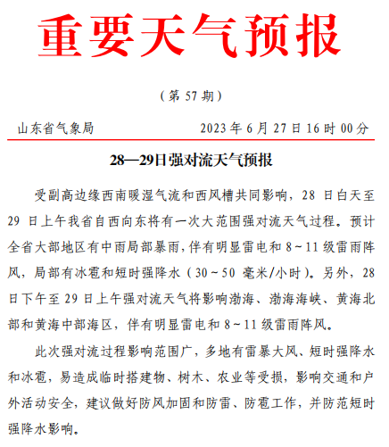 6月27日16時(shí),山東省氣象臺(tái)發(fā)布重要天氣預(yù)報(bào):受副高邊緣西南暖濕氣流和西風(fēng)槽共同影響,28日白天至29日上午山東自西向東將有一次大范圍強(qiáng)對(duì)流天氣過(guò)程。預(yù)計(jì)全省大部地區(qū)有中雨局部暴雨,伴有明顯雷電和8—11級(jí)雷雨陣風(fēng),局部有冰雹和短時(shí)強(qiáng)降水(30—50毫米/小時(shí))。另外,28日下午至29日上午強(qiáng)對(duì)流天氣將影響渤海、渤海海峽、黃海北部和黃海中部海區(qū),伴有明顯雷電和8—11級(jí)雷雨陣風(fēng)。
