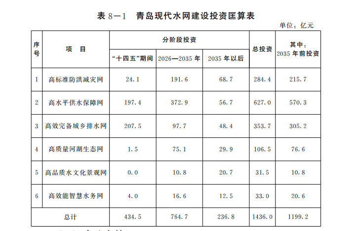 (一)投資匡算。規(guī)劃匡算總投資1436億元。2035年前投資約1199.2億元,其中防洪減災(zāi)215.7億元、供水保障570.3億元、城鄉(xiāng)排水305.2億元、水生態(tài)保護(hù)與修復(fù)76.6億元、水文化景觀10.8億元、智慧水網(wǎng)20.6億元。