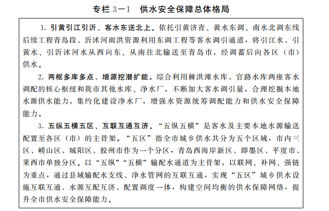 2.提升水資源均衡配置能力。推進(jìn)青島水網(wǎng)“五路”大動(dòng)脈建設(shè),完善水網(wǎng)之“綱”。加快構(gòu)建配套銜接的區(qū)域水資源配置工程體系,因地制宜完善農(nóng)村供水工程網(wǎng)絡(luò),提升農(nóng)業(yè)灌溉供水保障水平,織密水網(wǎng)之“目”。充分挖掘現(xiàn)有水庫(kù)供水潛力,加快官路等重點(diǎn)水庫(kù)建設(shè),加強(qiáng)戰(zhàn)略?xún)?chǔ)備水源建設(shè),打牢水網(wǎng)之“結(jié)”。協(xié)同推進(jìn)市級(jí)、縣級(jí)水資源配置工程建設(shè),打通城鄉(xiāng)供水保障“最后一米”。