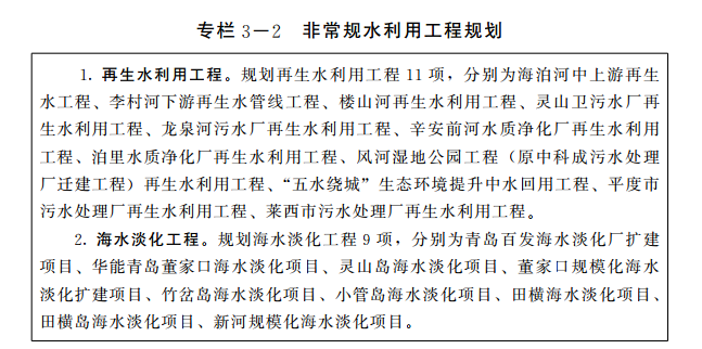 3.加大非常規(guī)水源利用。將污水資源化利用作為節(jié)水開(kāi)源的重要內(nèi)容,不斷加大再生水利用力度,建設(shè)再生水利用工程11項(xiàng),新增再生水利用能力95.5萬(wàn)立方米/日。因地制宜推進(jìn)海水淡化工程建設(shè),建設(shè)海水淡化工程9項(xiàng),新增海水淡化裝置規(guī)模35.33萬(wàn)立方米/日;提高海水淡化利用量,納入全市水資源統(tǒng)一配置,作為工業(yè)、市政新增供水及城市備用的重要水源。加快海水淡化科技創(chuàng)新,構(gòu)建科技引領(lǐng)的海水淡化全產(chǎn)業(yè)鏈條。擴(kuò)大海水直接利用領(lǐng)域。
