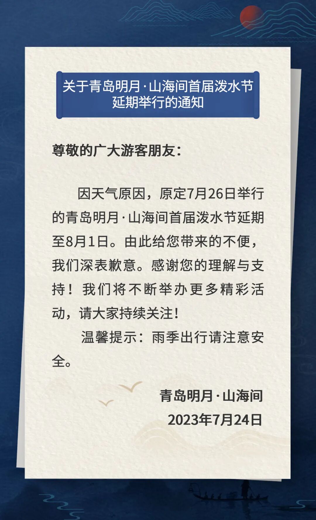 周知:因天氣原因,青島明月山海間首屆潑水節(jié)延期至8月1日舉行