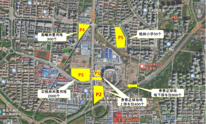 注意!青春足球場地上(P1)、地下(P2)停車場需持通行證進出,后桃林閑置用地(P3)、南疃閑置用地(P4)、桃林小學(P5)可停放車輛。