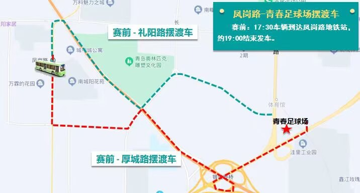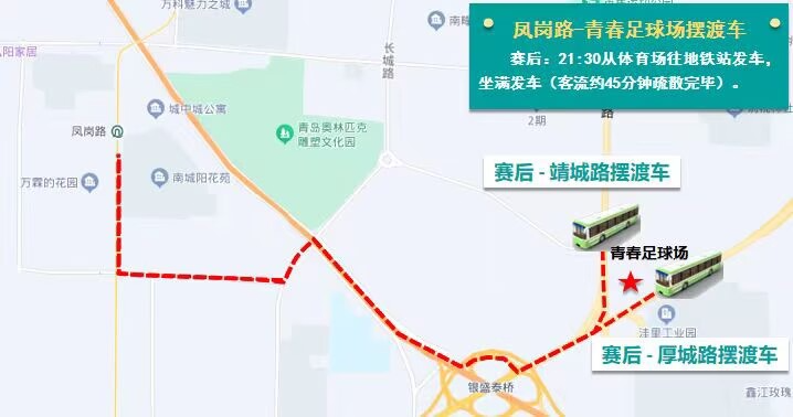 城運集團提供地鐵1號線鳳崗路地鐵站至青春足球場之間往返擺渡車,微信搜索“海牛青春社區(qū)”小程序可購買車票,球迷可在鳳崗路地鐵站B口、D口出站換乘擺渡車直達青春足球