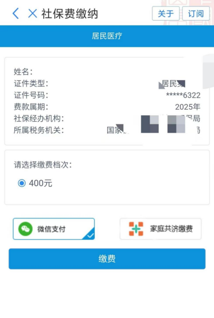 6.選擇“微信支付”或“家庭共濟繳費”,點擊“繳費”,繳費成功后,就完成參保啦!