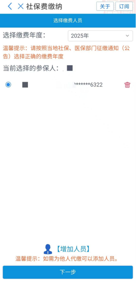 5.選擇繳費年度及參保人。若需為他人代繳,可點擊下方“添加人員”,并填寫參保人員信息