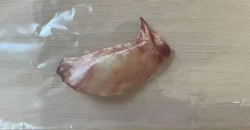 所幸,魚刺只是扎在心臟表層,還沒有深入心肌,在團(tuán)隊(duì)配合下,魚刺一點(diǎn)一點(diǎn)被取了出來,是一片巨大的扇形不規(guī)則魚骨片,約4厘米長,3厘米寬,一頭還帶著尖刺。