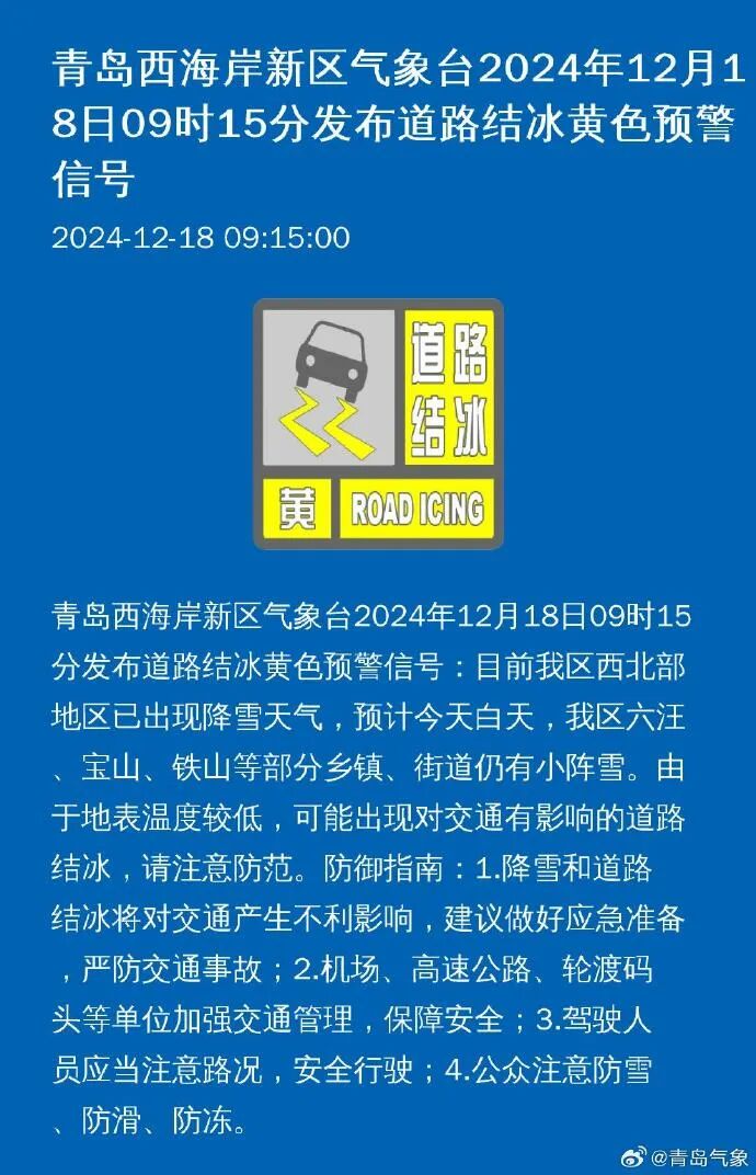 就在剛剛,西海岸新區(qū)、膠州市、平度市陸續(xù)發(fā)布道路結(jié)冰黃色預(yù)警信號(hào),提醒大家務(wù)必注意出行安全!