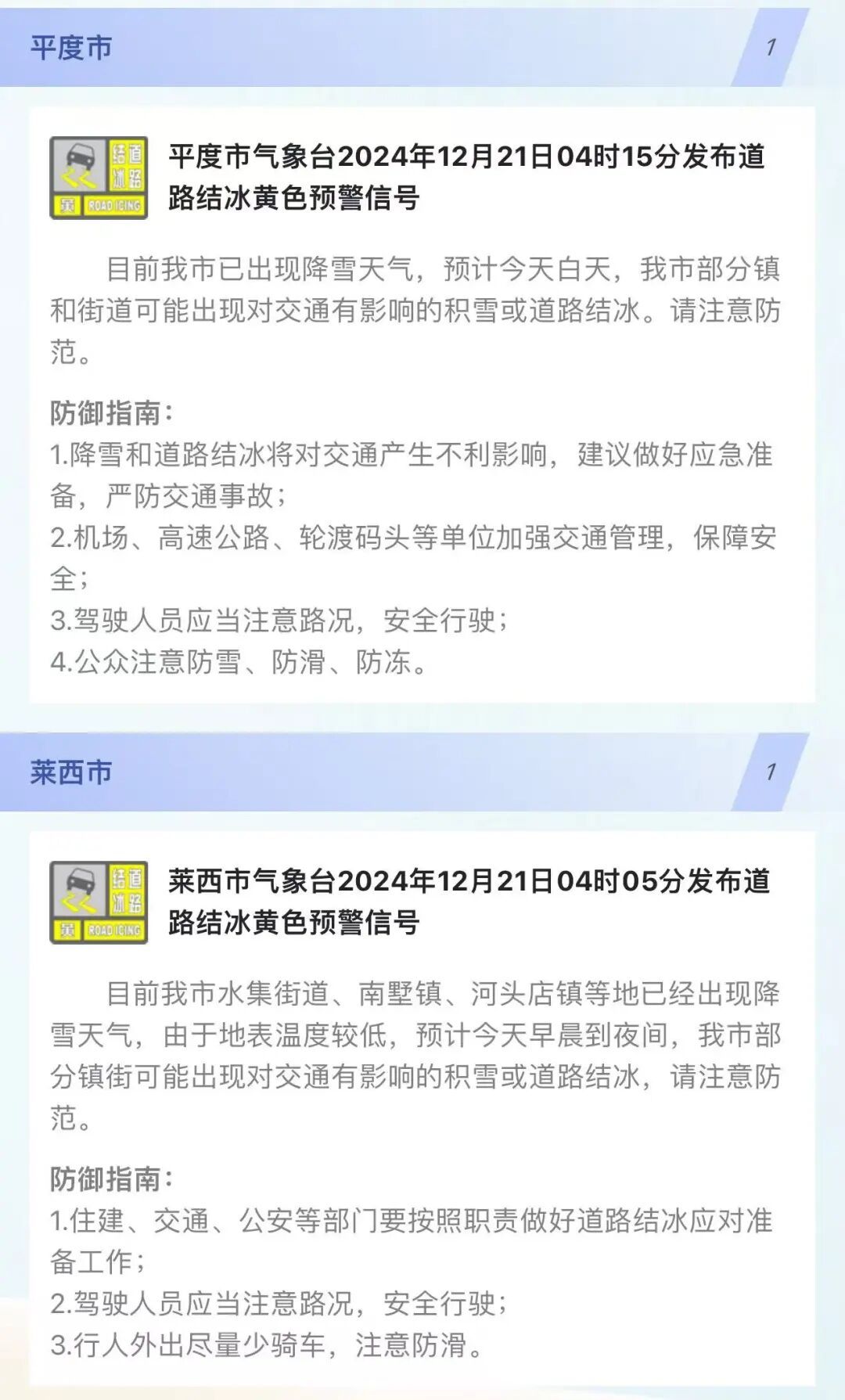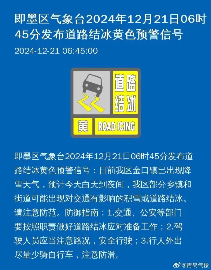 此前,平度市、萊西市也都發(fā)布了道路結(jié)冰黃色預(yù)警信號(hào),請(qǐng)大家注意防范↓↓↓