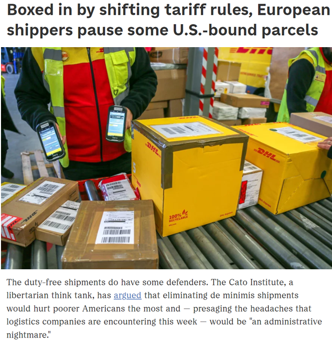 美國全國公共廣播電臺(tái)日前援引美國智庫凱托學(xué)會(huì)發(fā)布的一份分析報(bào)告稱,美國政府取消對(duì)小額進(jìn)口包裹的免稅待遇,該措施將嚴(yán)重傷害美國的低收入群體,使物流運(yùn)輸公司進(jìn)一步陷入困境,并將在實(shí)際執(zhí)行層面遇到嚴(yán)重問題。