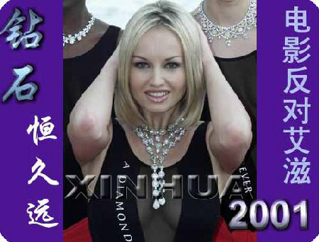 捷克超級(jí)模特、法國(guó)足球明星克里斯蒂安·卡朗伯的妻子阿德里安娜在第54屆戛納電影節(jié)上參加“鉆石恒久遠(yuǎn):2001年電影反對(duì)艾滋”展示會(huì)。模特們佩帶價(jià)值2500萬美元的鉆石,為美國(guó)艾滋病研究基金會(huì)舉行義演。