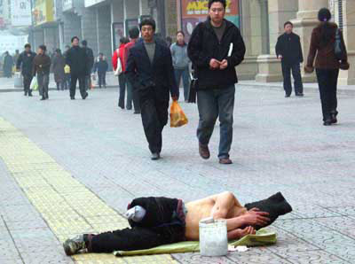 這個乞丐的大名在西安的乞丐部落里可以說無人不曉,因為他是數(shù)九天里為數(shù)不多的敢脫成光膀子的乞丐,就因為這一脫,他每次出來要比別人要錢要的多。